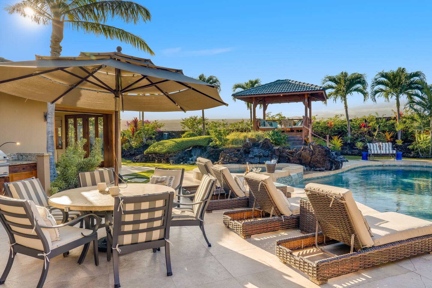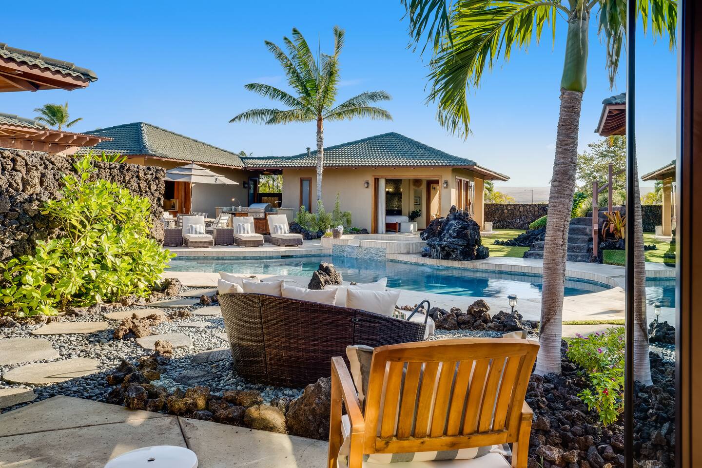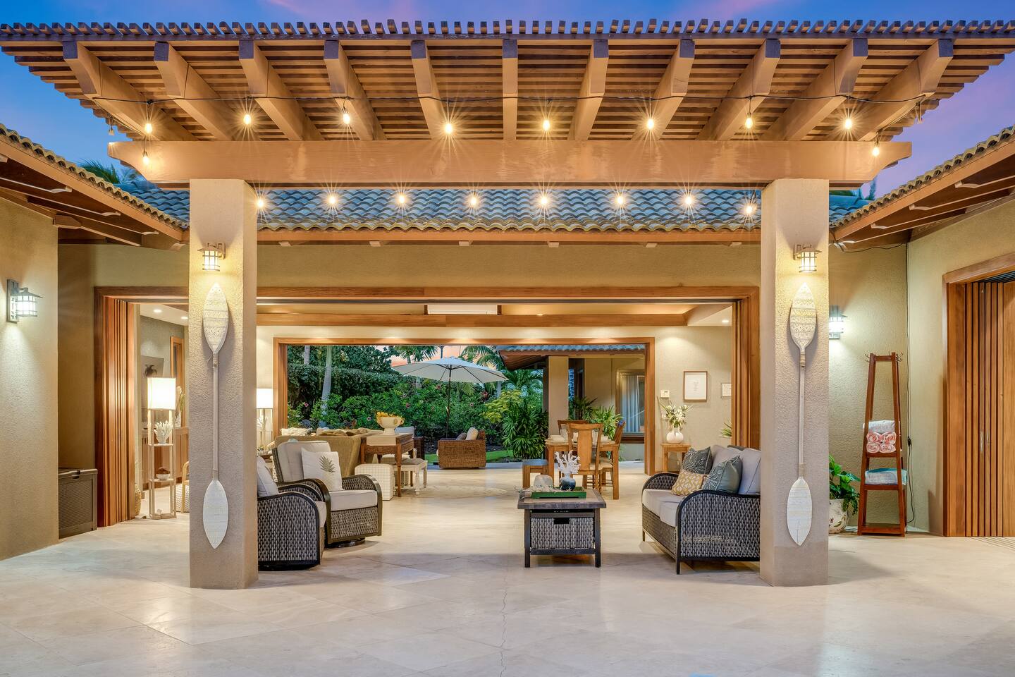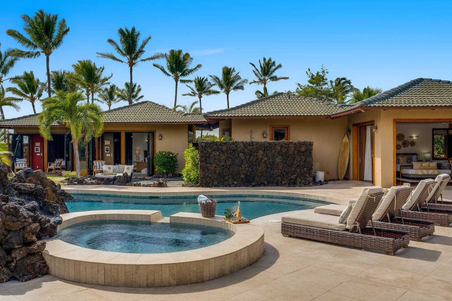 Welcome to Hale Mele — A Premier Hawaiian Retreat on the Big Island’s South Kohala Coast Escape to Hale Mele, an extraordinary luxury residence situated within the exclusive, gated community of Champion Ridge on the radiant South Kohala Gold Coast. Recognized by Condé Nast Traveler as one of 2024’s Top 27 Family-Friendly Airbnbs, this refined, single-level Polynesian-style estate spans nearly 4,000 square feet, offering an exceptional blend of island elegance, modern comfort, and breathtaking natural beauty. Property Overview Designed with privacy and relaxation in mind, Hale Mele features four spacious ground-level bedrooms, five full bathrooms, two half baths, and two private outdoor showers. The thoughtful layout includes: • Two primary suites with king beds, one of which offers an additional daybed for a child. Both suites offer a private outdoor shower. • A third bedroom with a king bed. • A fourth bedroom with two full-size beds. • A versatile bonus/game room with a queen-size sleeper sofa featuring a memory foam mattress. • Infant-friendly amenities, including a Pack ‘n Play, booster seat and infant tableware. The home’s two-bedroom pods connected via a pass-through door offer both communal gathering spaces and private retreats — ideal for multi-generational families or groups of friends. Indoor-Outdoor Island Living The heart of Hale Mele is its open-concept great room, seamlessly extending to a private outdoor oasis. At its center is a heated 84°F saltwater pool, hot tub, and serene cascading water features framed by lush, tropical landscaping. An outdoor pavilion offers shaded seating, a bar area, a barbecue grill, and a guest bathroom — the perfect setting for sunset cocktails and al fresco dining with panoramic views of Mauna Kea volcano. Home Amenities • Air conditioning throughout the entire residence for your comfort. • Fully equipped gourmet kitchen, thoughtfully stocked with essentials including olive oil, vinegar, sea salt, pepper, and a curated selection of spices. • High-performance Vitamix blender, perfect for crafting smoothies and frozen cocktails. • Complimentary Kona coffee starter pack, a variety of fine teas, and locally crafted Hawaiian chocolates to welcome you. • Laundry essentials provided, including laundry pods and dryer sheets for your convenience. • Premium bath amenities in every bathroom, featuring shampoo, conditioner, and luxurious body wash. Exclusive Amenities Guests enjoy access to a well-appointed garage stocked with everything needed for a perfect day of island adventure, including: • Boogie boards, beach chairs, a cooler, sunshade, youth life jackets. • A variety of beach and pool toys for children. • 6-seater electric golf cart, ideal for effortless exploration of the resort. • Two electric bikes and one traditional bicycle, complete with helmets and locks. • Privileged access to the Mauna Lani Beach Club grants entry to a private white-sand cove with complimentary lounge chairs, paddle board rentals, and beachfront dining at Napua Restaurant. This access does not include use of the hotel pools or other hotel amenities. Local Activities & Excursions Indulge in world-class recreation with nearby attractions, including: • Mauna Lani North & South golf courses (contact directly for tee times and rates). • Mauna Lani Tennis and Fitness Club, featuring tennis, pickleball, a lap pool, and fitness facilities (weekly rates: $300 per person / $600 per family). • Famed beaches such as Kua Bay, 49 Black Sand Beach, Hapuna, and Mauna Kea Beach. • Champion Ridge’s open green spaces, offering fresh fruit and herb picking. • Adventure experiences including: manta ray night dives, zip lining, fishing charters, snorkeling, helicopter tours, whale watching, hiking, and surf lessons. Personalized Concierge Services Enhance your stay with optional concierge services (available at an additional cost), including: • Private airport transfers • In-home spa treatments and manicures • Kitchen pre-stocking services • Private chef experiences Please note: weddings, receptions, and large gatherings are not permitted For safety, a discreet security camera monitors the driveway. Reserve Your Private Hawaiian Escape Experience Hawaiian luxury at Hale Mele, where every detail has been thoughtfully curated to create an unforgettable island retreat. Book your stay today and immerse yourself in the magic of the Big Island.