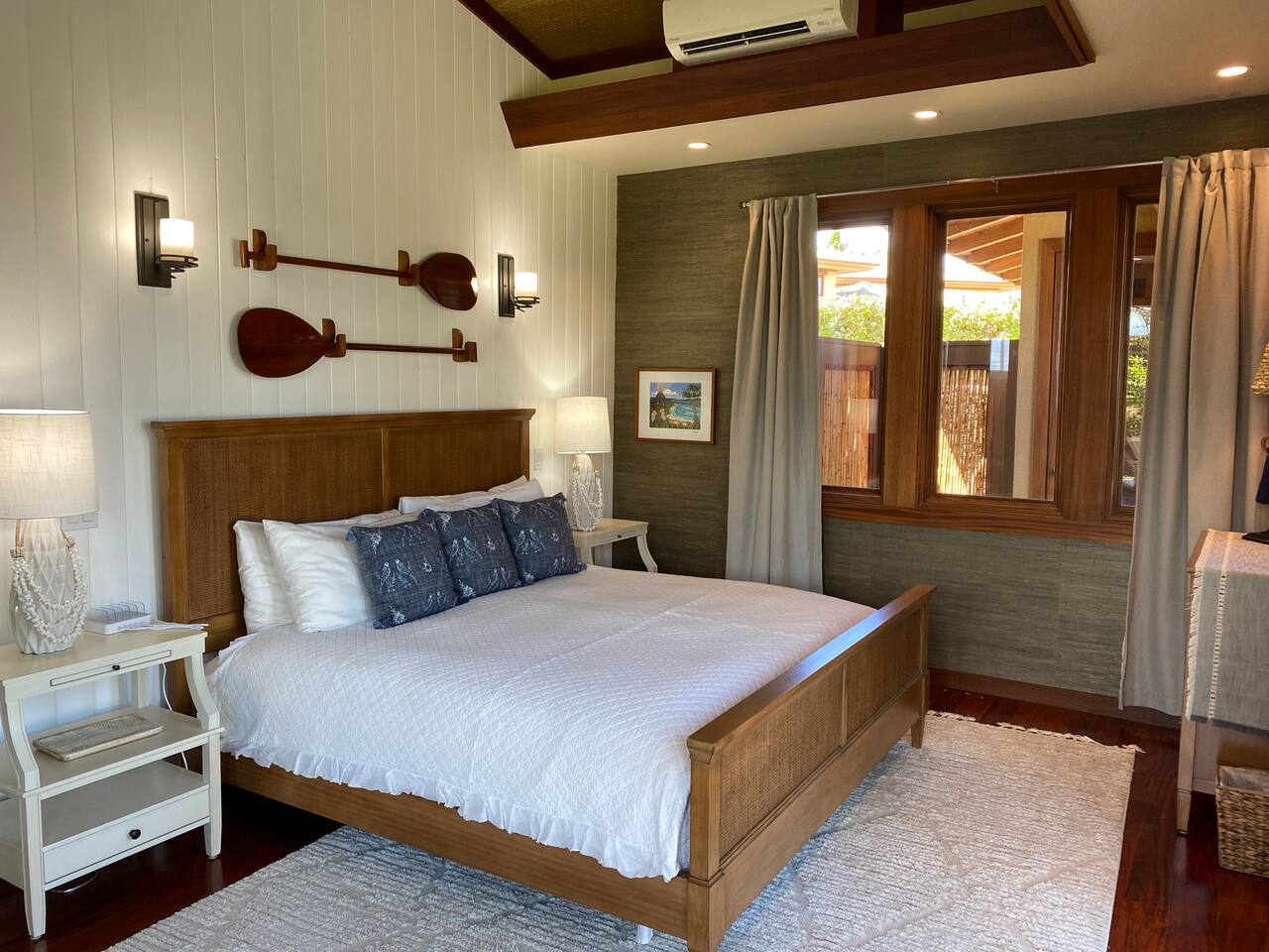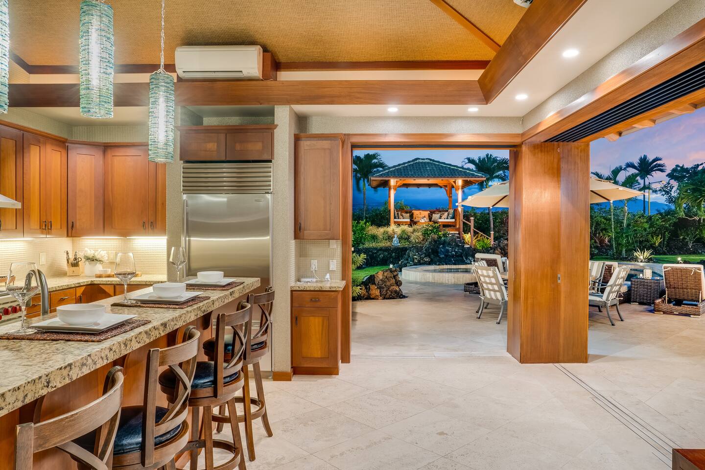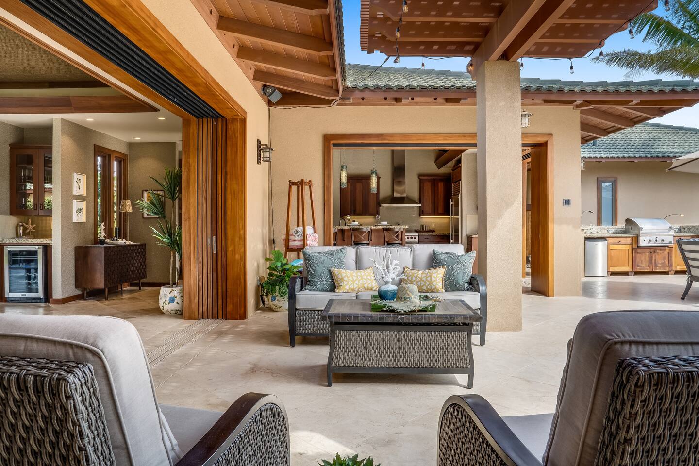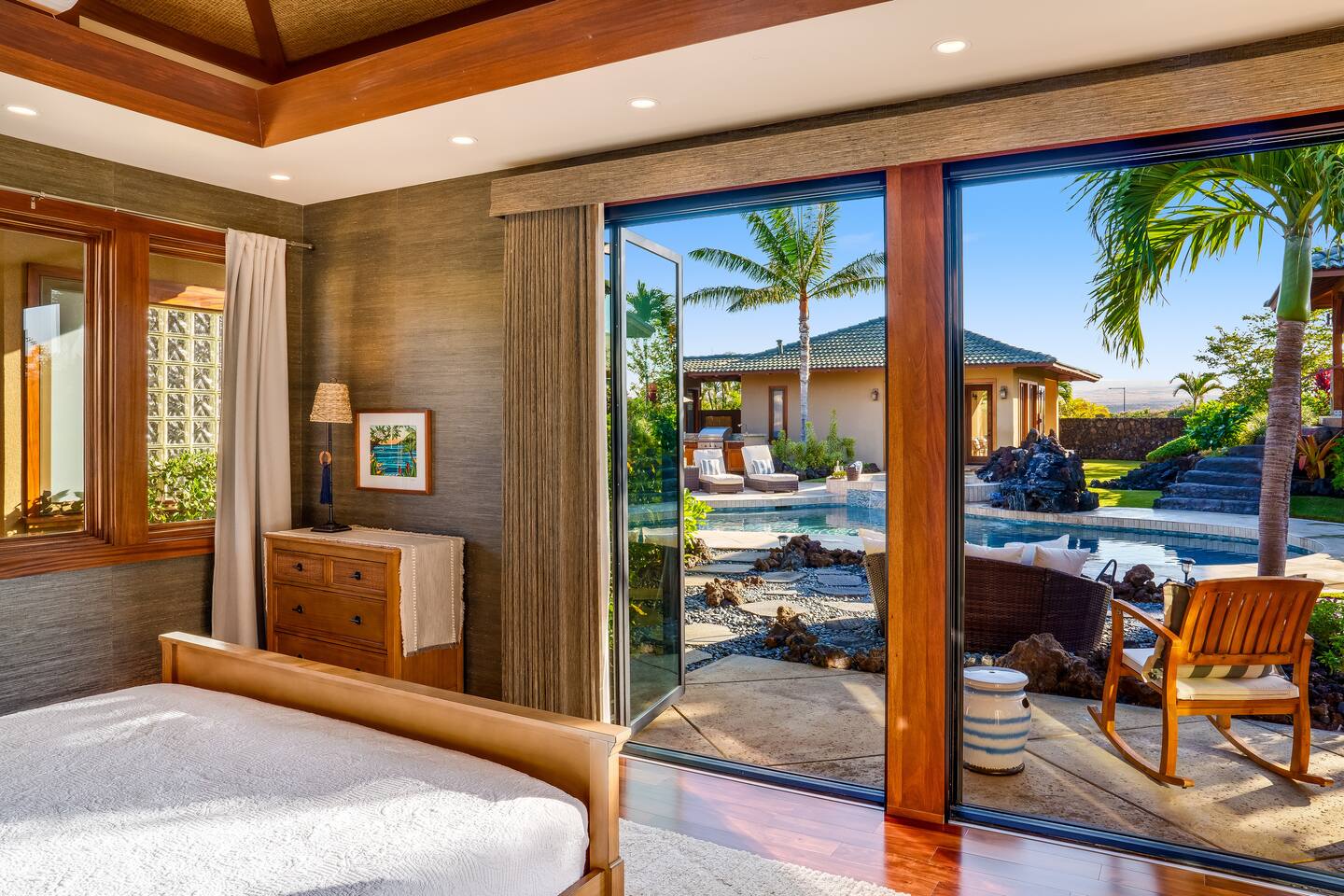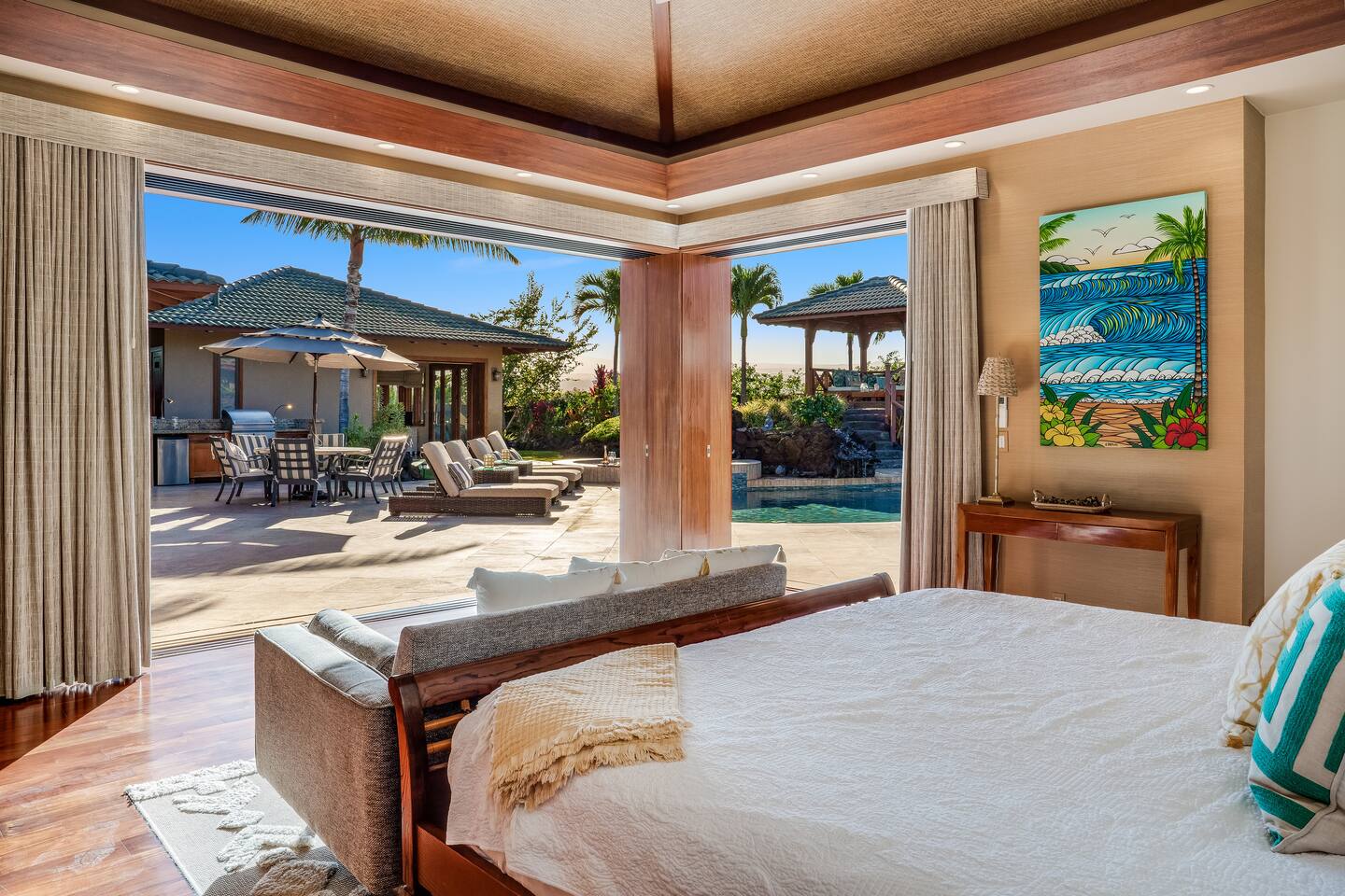 Welcome to Hale Mele — A Premier Hawaiian Retreat on the Big Island’s South Kohala Coast Escape to Hale Mele, an extraordinary luxury residence situated within the exclusive, gated community of Champion Ridge on the radiant South Kohala Gold Coast. Recognized by Condé Nast Traveler as one of 2024’s Top 27 Family-Friendly Airbnbs, this refined, single-level Polynesian-style estate spans nearly 4,000 square feet, offering an exceptional blend of island elegance, modern comfort, and breathtaking natural beauty. Property Overview Designed with privacy and relaxation in mind, Hale Mele features four spacious ground-level bedrooms, five full bathrooms, two half baths, and two private outdoor showers. The thoughtful layout includes: • Two primary suites with king beds, one of which offers an additional daybed for a child. Both suites offer a private outdoor shower. • A third bedroom with a king bed. • A fourth bedroom with two full-size beds. • A versatile bonus/game room with a queen-size sleeper sofa featuring a memory foam mattress. • Infant-friendly amenities, including a Pack ‘n Play, booster seat and infant tableware. The home’s two-bedroom pods connected via a pass-through door offer both communal gathering spaces and private retreats — ideal for multi-generational families or groups of friends. Indoor-Outdoor Island Living The heart of Hale Mele is its open-concept great room, seamlessly extending to a private outdoor oasis. At its center is a heated 84°F saltwater pool, hot tub, and serene cascading water features framed by lush, tropical landscaping. An outdoor pavilion offers shaded seating, a bar area, a barbecue grill, and a guest bathroom — the perfect setting for sunset cocktails and al fresco dining with panoramic views of Mauna Kea volcano. Home Amenities • Air conditioning throughout the entire residence for your comfort. • Fully equipped gourmet kitchen, thoughtfully stocked with essentials including olive oil, vinegar, sea salt, pepper, and a curated selection of spices. • High-performance Vitamix blender, perfect for crafting smoothies and frozen cocktails. • Complimentary Kona coffee starter pack, a variety of fine teas, and locally crafted Hawaiian chocolates to welcome you. • Laundry essentials provided, including laundry pods and dryer sheets for your convenience. • Premium bath amenities in every bathroom, featuring shampoo, conditioner, and luxurious body wash. Exclusive Amenities Guests enjoy access to a well-appointed garage stocked with everything needed for a perfect day of island adventure, including: • Boogie boards, beach chairs, a cooler, sunshade, youth life jackets. • A variety of beach and pool toys for children. • 6-seater electric golf cart, ideal for effortless exploration of the resort. • Two electric bikes and one traditional bicycle, complete with helmets and locks. • Privileged access to the Mauna Lani Beach Club grants entry to a private white-sand cove with complimentary lounge chairs, paddle board rentals, and beachfront dining at Napua Restaurant. This access does not include use of the hotel pools or other hotel amenities. Local Activities & Excursions Indulge in world-class recreation with nearby attractions, including: • Mauna Lani North & South golf courses (contact directly for tee times and rates). • Mauna Lani Tennis and Fitness Club, featuring tennis, pickleball, a lap pool, and fitness facilities (weekly rates: $300 per person / $600 per family). • Famed beaches such as Kua Bay, 49 Black Sand Beach, Hapuna, and Mauna Kea Beach. • Champion Ridge’s open green spaces, offering fresh fruit and herb picking. • Adventure experiences including: manta ray night dives, zip lining, fishing charters, snorkeling, helicopter tours, whale watching, hiking, and surf lessons. Personalized Concierge Services Enhance your stay with optional concierge services (available at an additional cost), including: • Private airport transfers • In-home spa treatments and manicures • Kitchen pre-stocking services • Private chef experiences Please note: weddings, receptions, and large gatherings are not permitted For safety, a discreet security camera monitors the driveway. Reserve Your Private Hawaiian Escape Experience Hawaiian luxury at Hale Mele, where every detail has been thoughtfully curated to create an unforgettable island retreat. Book your stay today and immerse yourself in the magic of the Big Island.