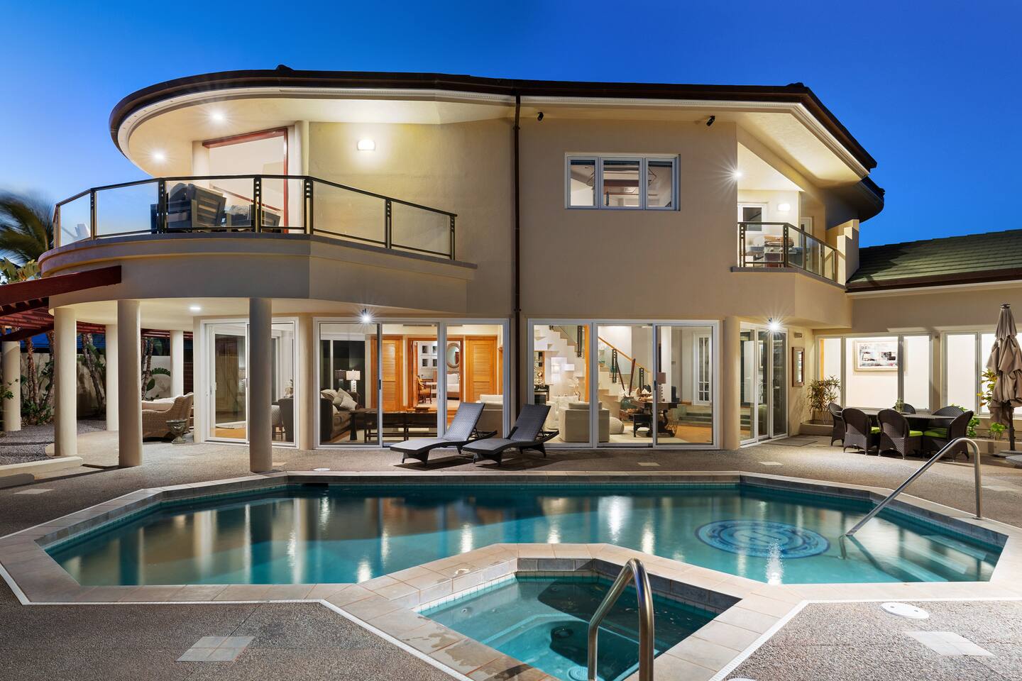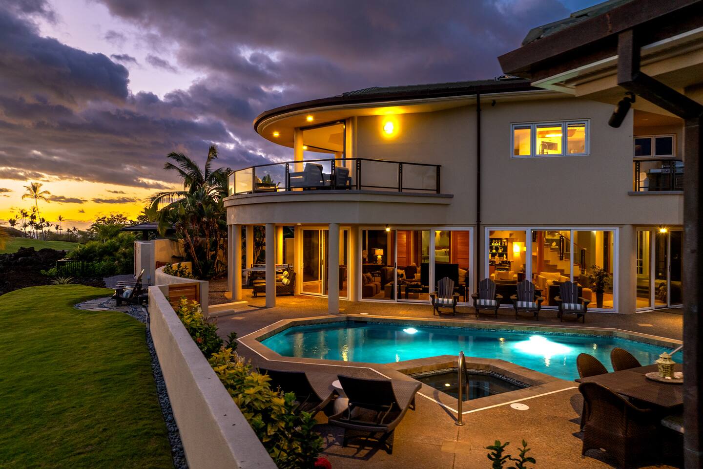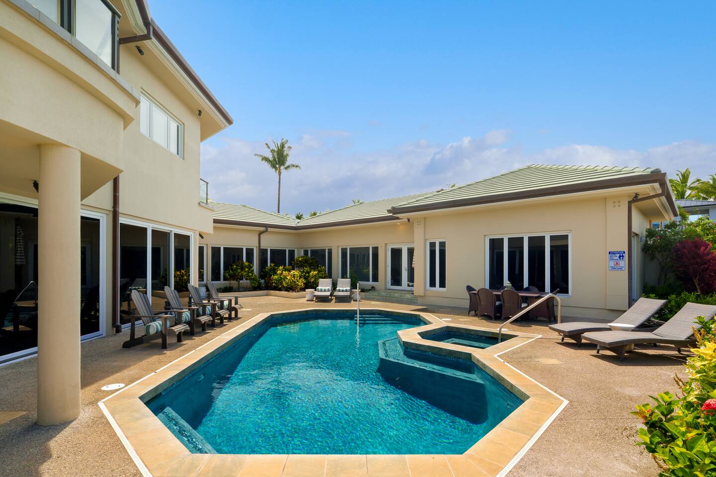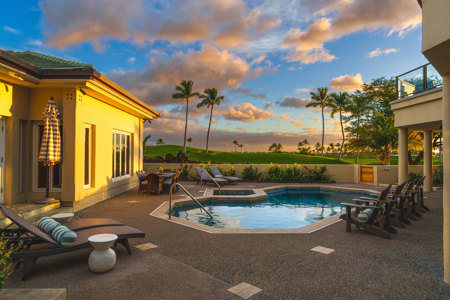 Welcome to Hale Mele 2 — A Private Island Retreat of Elegance and Comfort Discover the ultimate Hawaiian escape at Hale Mele 2, an elegant 5,100-square-foot, two-story luxury residence nestled within the prestigious Champion Ridge gated community on the Big Island’s South Kohala Gold Coast. With sweeping 270-degree views of lush golf courses and the majestic Mauna Kea volcano, this exceptional home blends refined sophistication with serene tropical ambiance — ideal for families or groups seeking an extraordinary island getaway. Property Highlights Thoughtfully designed with both relaxation and entertainment in mind, Hale Mele 2 offers: Five spacious bedrooms, four full bathrooms, one 3/4 bath, two half bathrooms. • Two primary suites each featuring a luxurious king-size mattress for restful, resort-quality comfort, one of which offers an additional daybed for a child. Both suites have a full bath with tub and shower. • A third bedroom with a king-size bed and 3/4 bath with shower. • A fourth bedroom with two queen-size beds and a full-size pullout sofa, ideal for families or groups traveling together. Full bath with tub and shower. • A second floor fifth bedroom with king-size bed and 1/2 bath. • A private deck with a heated pool, hot tub, and open-air balcony — perfect for savoring vivid Hawaiian sunsets • Meticulously landscaped half-acre grounds, offering peace, privacy, and beauty at every turn. Home Amenities • Air conditioning throughout the entire residence for your comfort. • Fully equipped kitchen, thoughtfully stocked with essentials including olive oil, vinegar, sea salt, pepper, and a curated selection of spices. • High-performance Vitamix blender, perfect for crafting smoothies and frozen cocktails. • Complimentary Kona coffee starter pack, a variety of teas, and local Hawaiian chocolates to welcome you. • Laundry essentials provided, including laundry pods and dryer sheets for your convenience. • Premium bath amenities in every bathroom, featuring shampoo, conditioner, and body wash. • Entertainment and leisure options abound, featuring Fubo TV, a foosball table, ping pong, Xbox, corn hole, and a premium Sonos sound system. • In home private workout room equipped with adjustable dumbbells (up to 52.5 lbs), a bench, yoga mats and pull-up bar • Infant-friendly amenities, including a Pack ‘n Play, high chair and infant tableware. Exclusive Guest Amenities Guests enjoy access to a well-appointed garage stocked with everything needed for a perfect day of island adventure, including: • Boogie boards, beach chairs, cooler, youth life jackets and sunshade. • A variety of beach and pool toys for children. • 6-seater and 4- seater electric golf cart, ideal for effortless exploration of the resort. • Two electric bikes and two traditional bicycle, complete with helmets and locks. • Privileged access to the Mauna Lani Beach Club grants entry to a private white-sand cove with complimentary lounge chairs, paddle board rentals, and beachfront dining at Napua Restaurant. This access does not include use of the hotel pools and other hotel amenities. Local Activities & Excursions Indulge in world-class recreation with nearby attractions, including: • Mauna Lani North & South golf courses (contact directly for tee times and rates). • Mauna Lani Tennis and Fitness Club, featuring tennis, pickleball, a lap pool, and fitness facilities (weekly rates: $300 per person / $600 per family). • Famed beaches such as Kua Bay, 49 Black Sand Beach, Hapuna, and Mauna Kea Beach. • Champion Ridge’s open green spaces, offering fresh fruit and herb picking. • Adventure experiences including: manta ray night dives, zip lining, fishing charters, snorkeling, helicopter tours, whale watching, hiking, and surf lessons. Personalized Concierge Services Enhance your stay with optional concierge services (available at an additional cost), including: • Private airport transfers • In-home spa treatments and manicures • Kitchen pre-stocking services • Private chef experiences Please note: weddings, receptions, and large gatherings are not permitted For safety, a discreet security camera monitors the driveway. Reserve Your Private Hawaiian Escape Experience Hawaiian luxury at Hale Mele 2, where every detail has been thoughtfully curated to create an unforgettable island retreat. Book your stay today and immerse yourself in the magic of the Big Island.